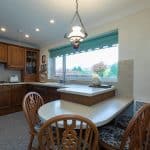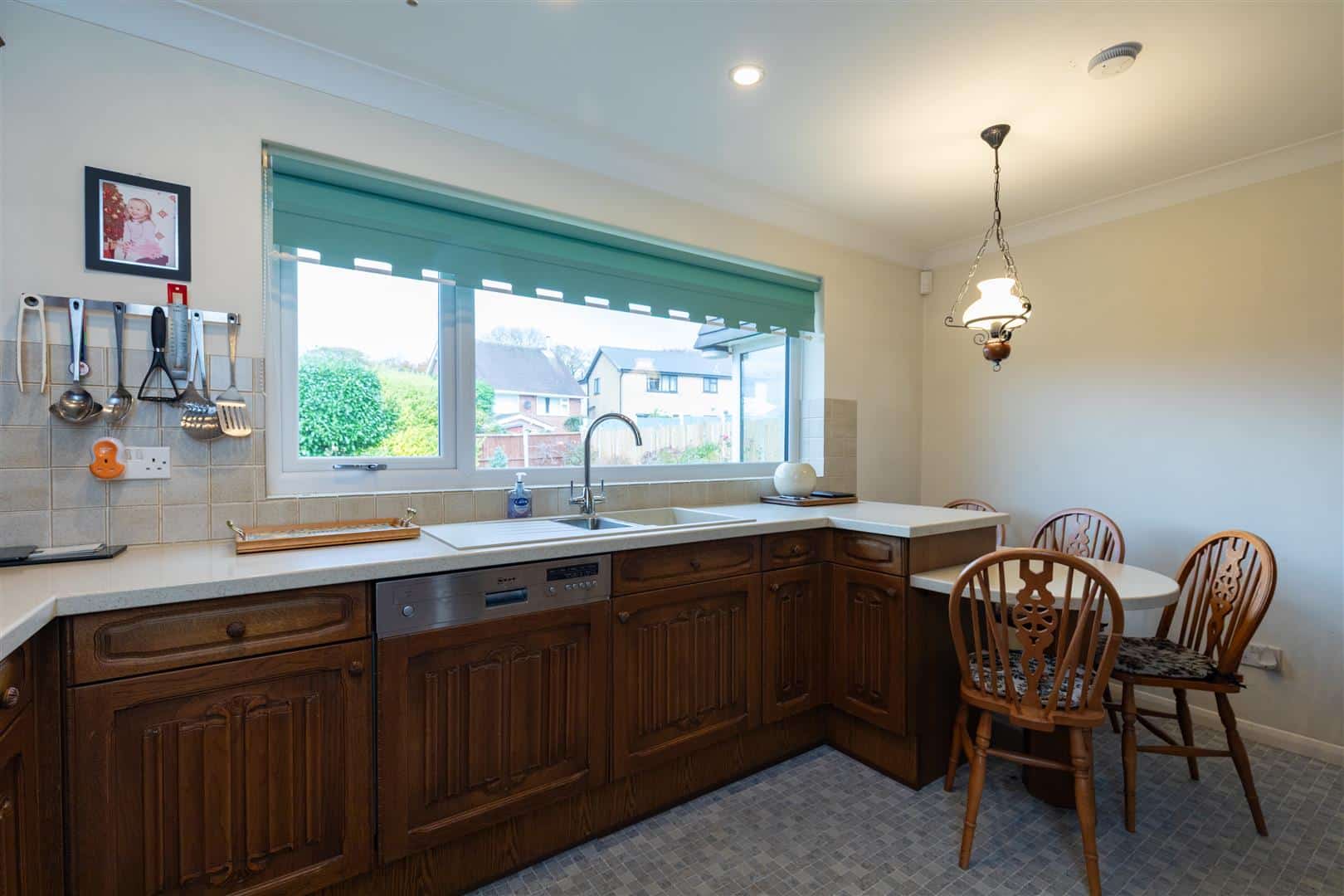 Wall and base units. Sink unit with drainer, rinser bowl and mixer map. Gas hob with extractor unit above. Double electric oven. Electric heater. Breakfast bar. Integrated dishwasher.