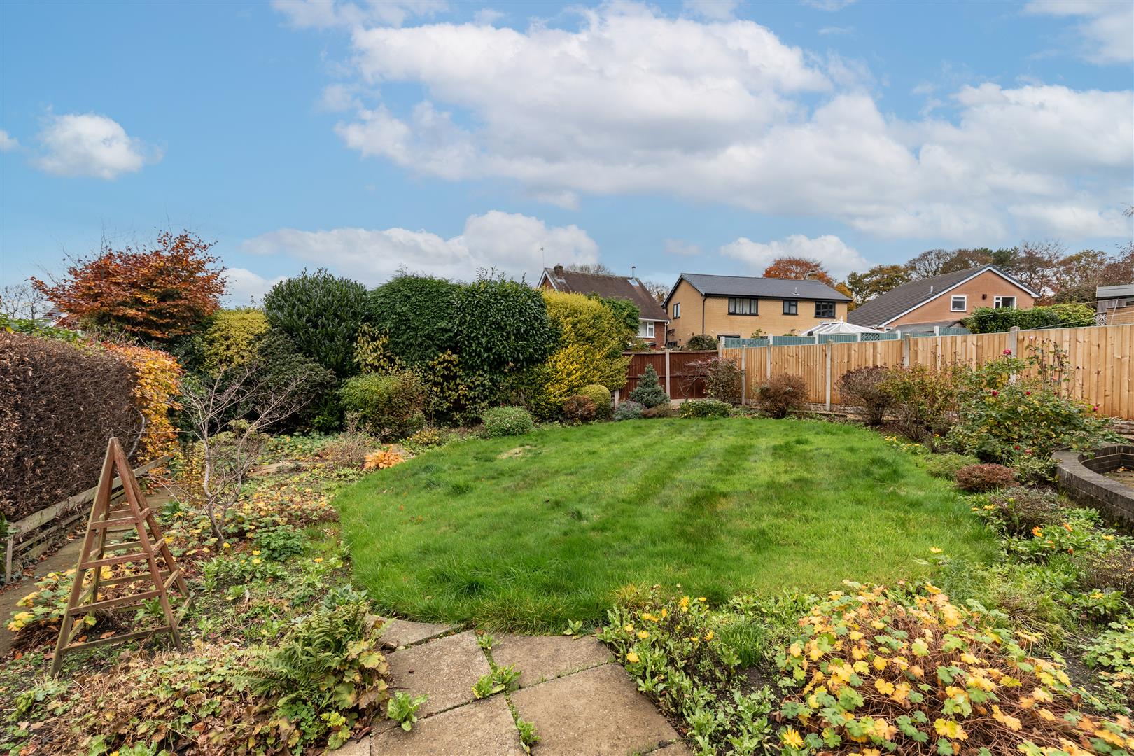 * Pleasant sized rear garden area laid mainly to lawn with display borders and patio area.