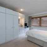 Radiator. Fitted range of wardrobes and storage units.