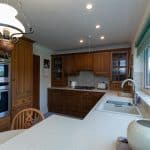 Tiled floor. Rear door. Wall and base units.