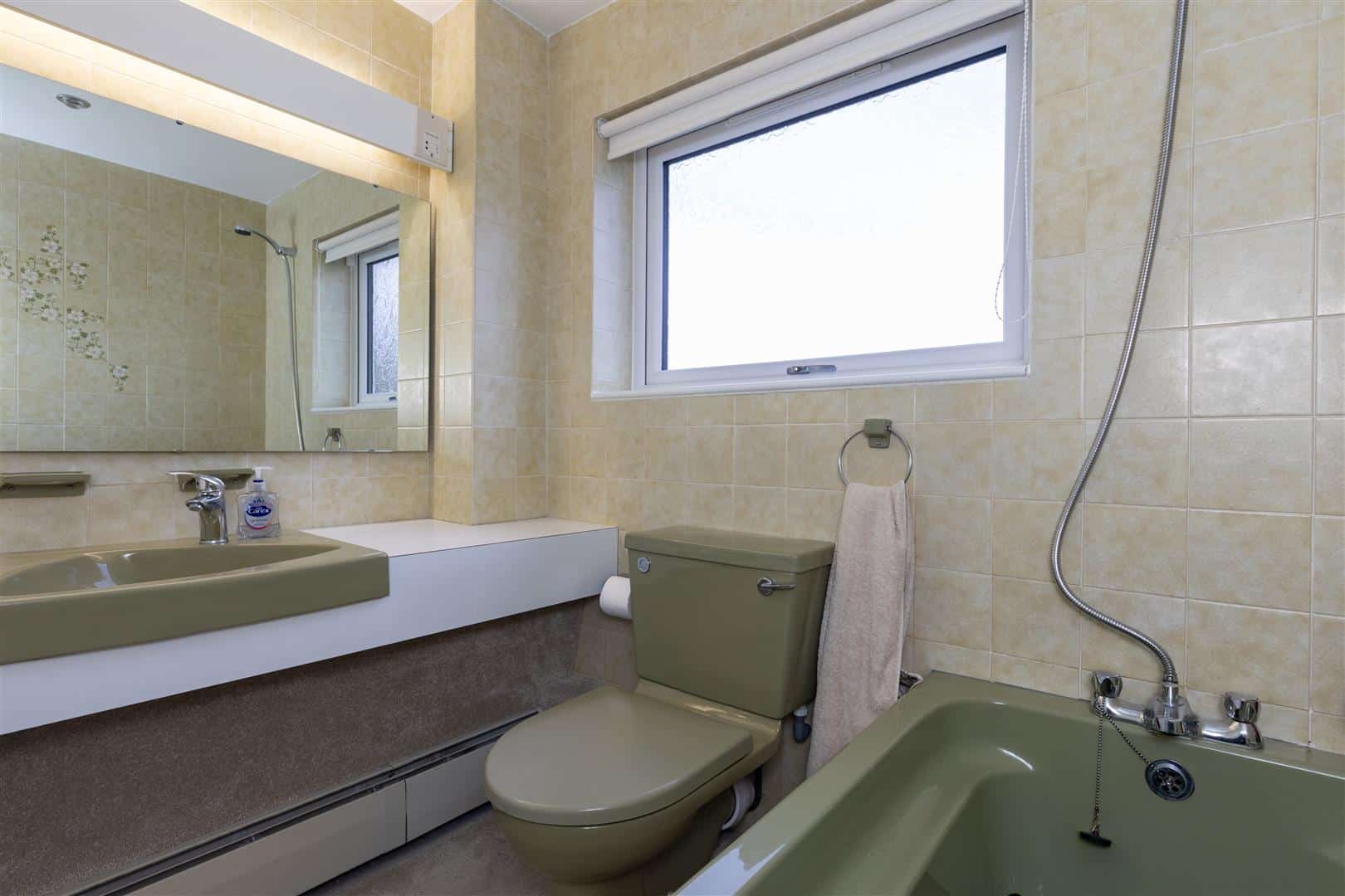 Bath with feeder shower over. W.c. Wash basin. Tiled walls.