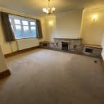 Glazed window with views over the road to the countryside beyond. Feature fireplace with stone surround, radiator, door with stairs leading to First floor and internal door to dining room.