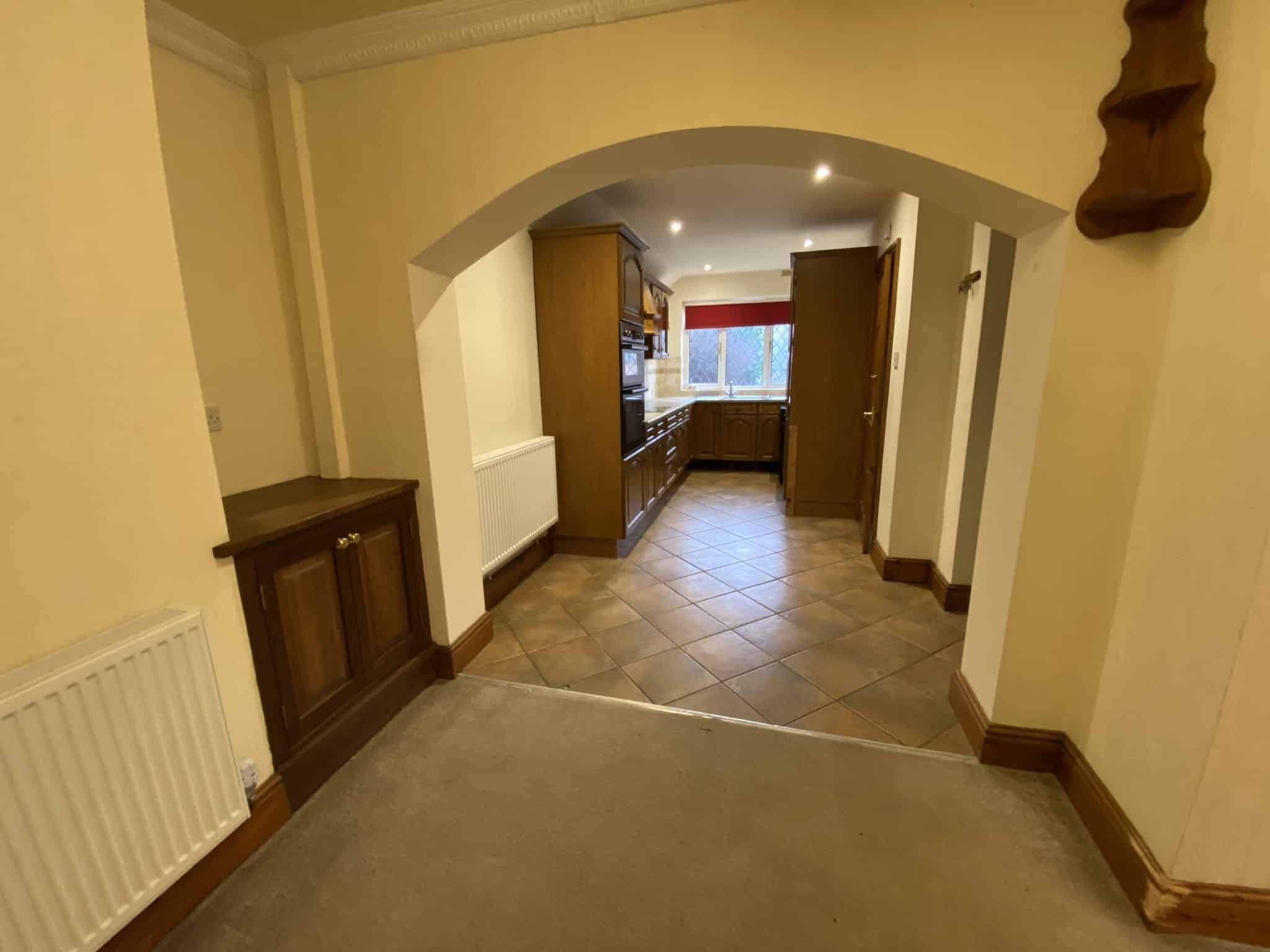 Large family dining area with window to side, radiator and open arch through to Kitchen.
