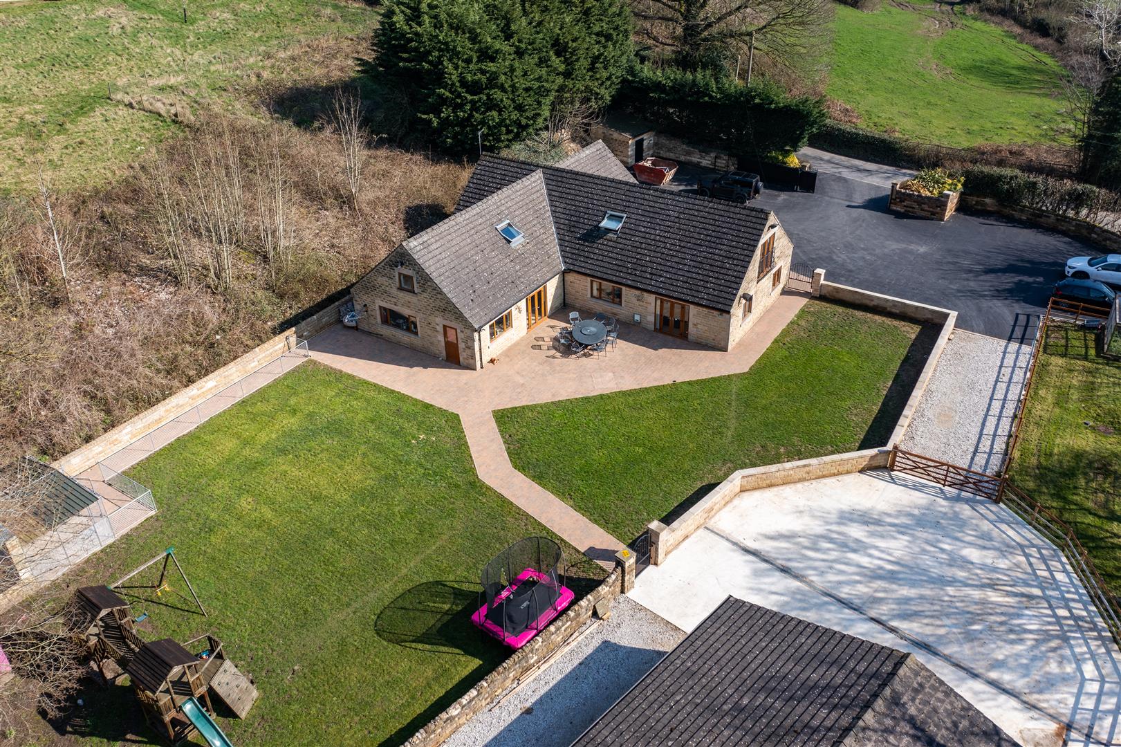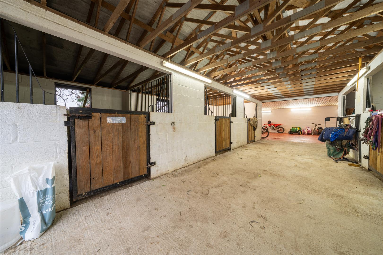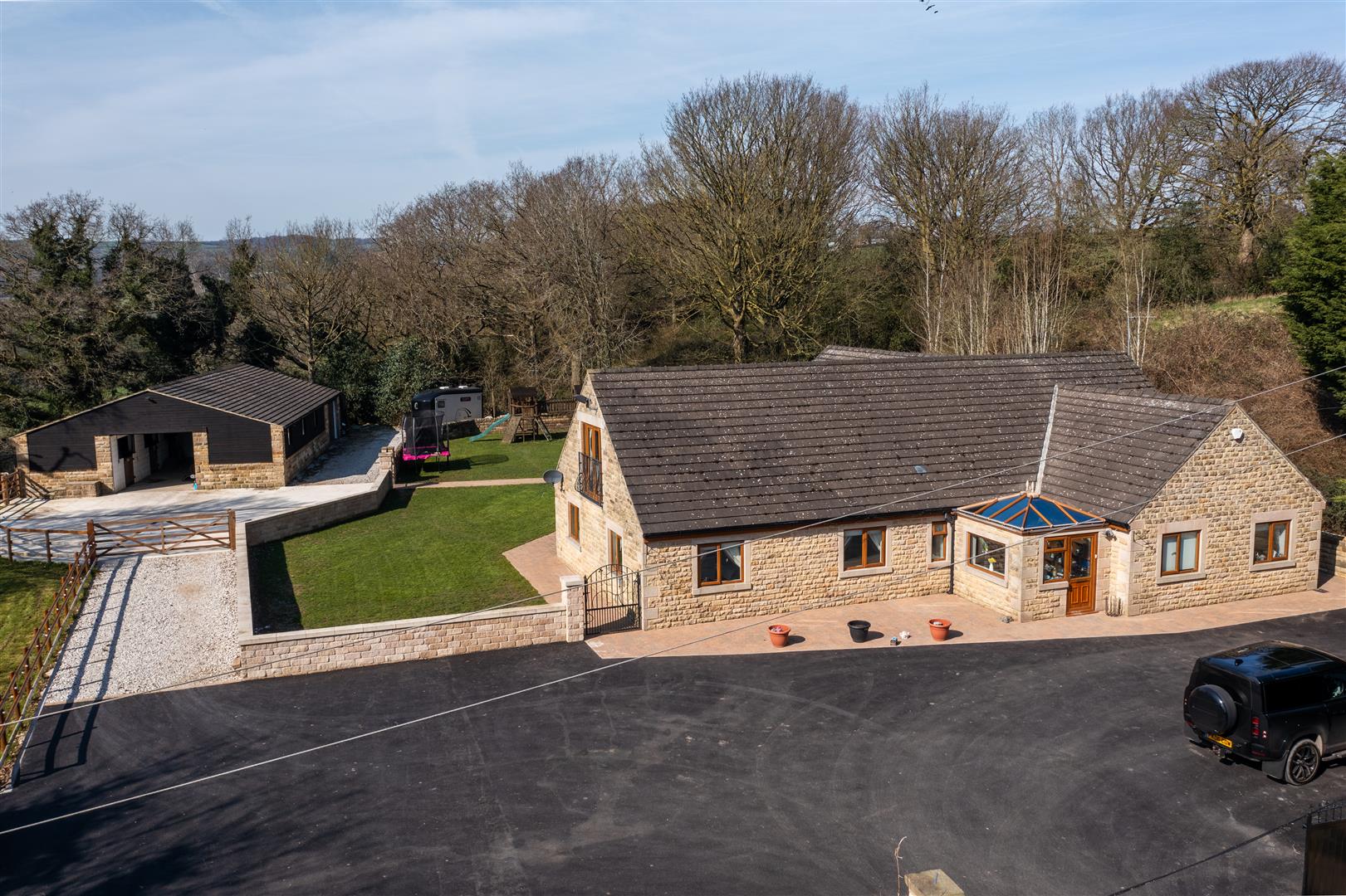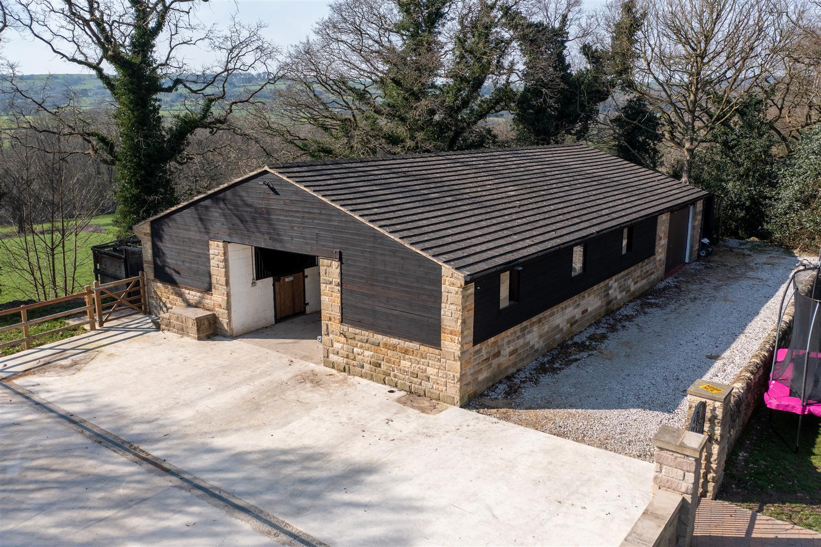 Hillside Lodge occupies a generous plot, with well-maintained picturesque gardens lying to the rear of the dwelling hosting an array of outside space and two large stone– built dog kennels. To the west of the dwelling lies a stone– built stable block/ garage with six 12x12m internal stables and a large garage area to the rear with a separate entrance. To the side of the property offers a stone outbuilding with an external run, currently utilised as a guinea pig house. To the front of the property offers a large tarmac driveway with ample parking for multiple vehicles.