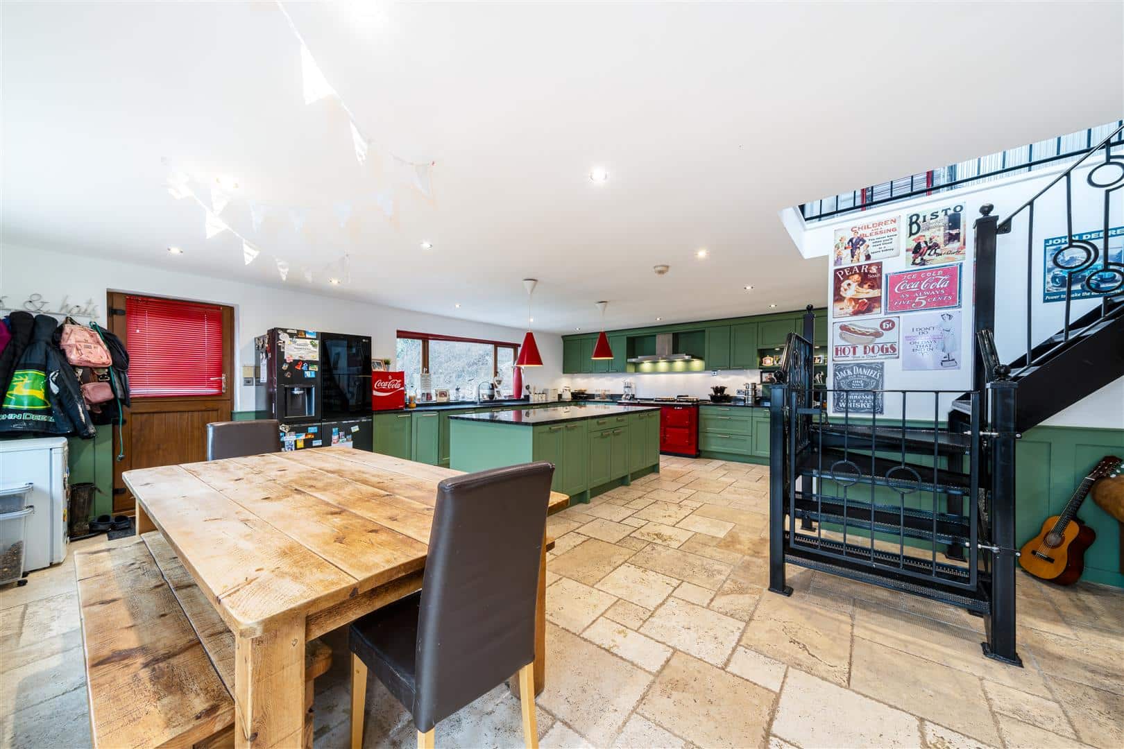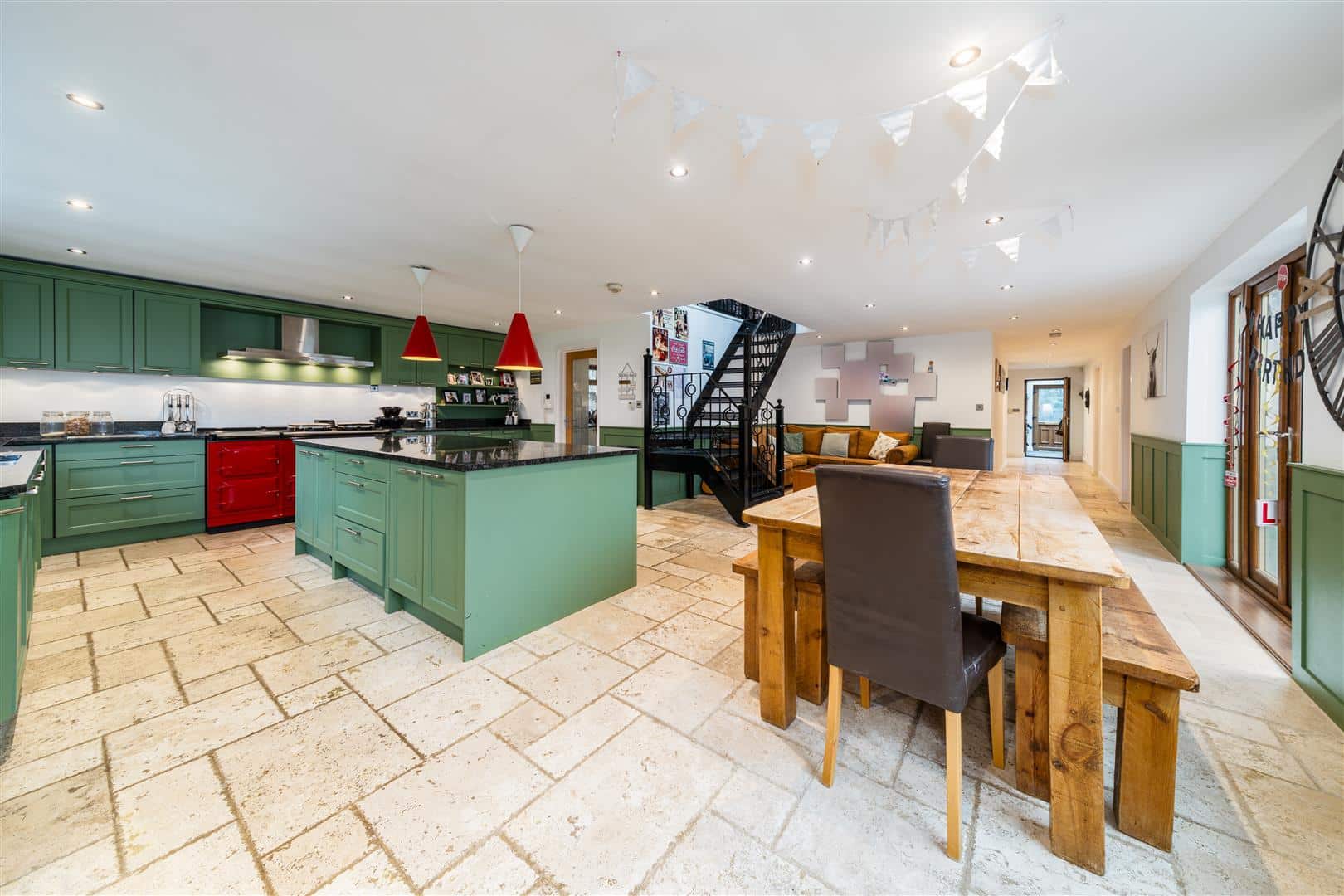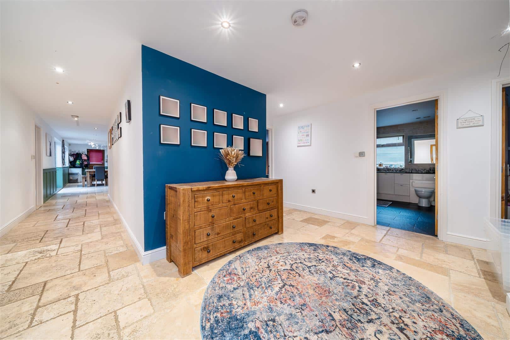Welcomed through the front porch to an inviting entrance hall, the ground floor offers an open plan kitchen/diner with patio doors to the rear creating a bright space. To the right of the entrance hall presents a large family bathroom, with a further three bedrooms. To the left of the hallway presents the master bedroom with built in wardrobes perfect for storage, together with an ensuite finished to a high standard. A living room locates off the kitchen with an open fire and patio doors to the rear garden. The kitchen/diner is equipped with an Aga, central island and fitted units with unique marble worktops, leading to a utility boasting external access to the rear garden .