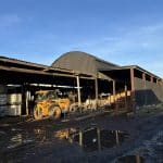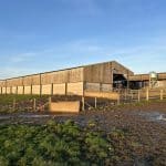 10. Dutch Barn – 4 bay steel frame Dutch barn with lean-to off each side, with corrugated metal roof and cladding with concrete floor to part. Additional lean-to pole barn to north side with concrete block walling to part.