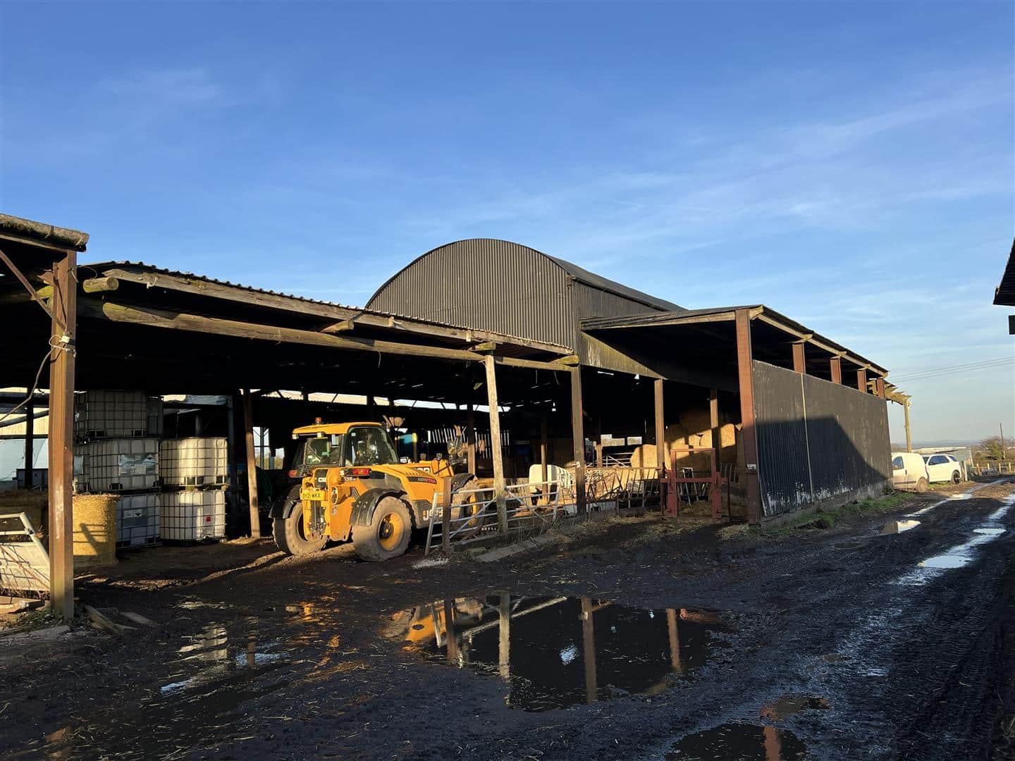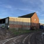 6. Pole Barn – 5 bay pole barn, having metal profile clad mono pitch roof and hardcore floor.