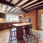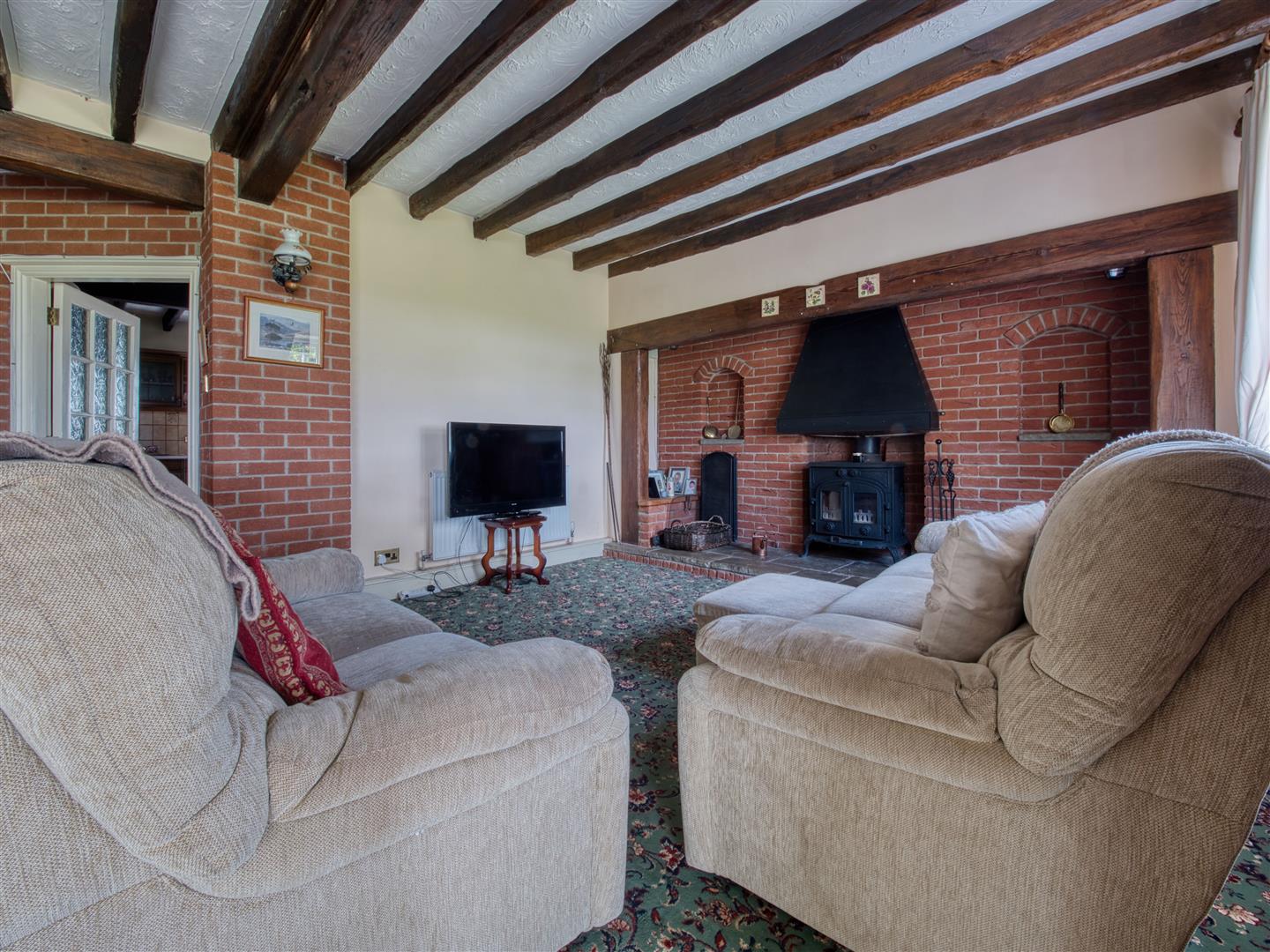 The Breakfast Kitchen is fitted with an extensive range of wall and base units and has a central island providing breakfast bar eating area, sink and drainer, electric double oven and integrated gas hob set within the exposed brick chimney breast. An internal access door leads from the Breakfast Kitchen to the Lounge which is a spacious reception room currently used as both an everyday sitting and dining area with feature inglenook fireplace having exposed Oak surround and exposed brick inset. Exposed beams to ceiling. Open plan to Garden Room and steps up to formal dining area. The Garden Room enjoys an outlook over the garden having a low level wall and double glazing to three sides, with double doors providing external access to the garden.
