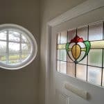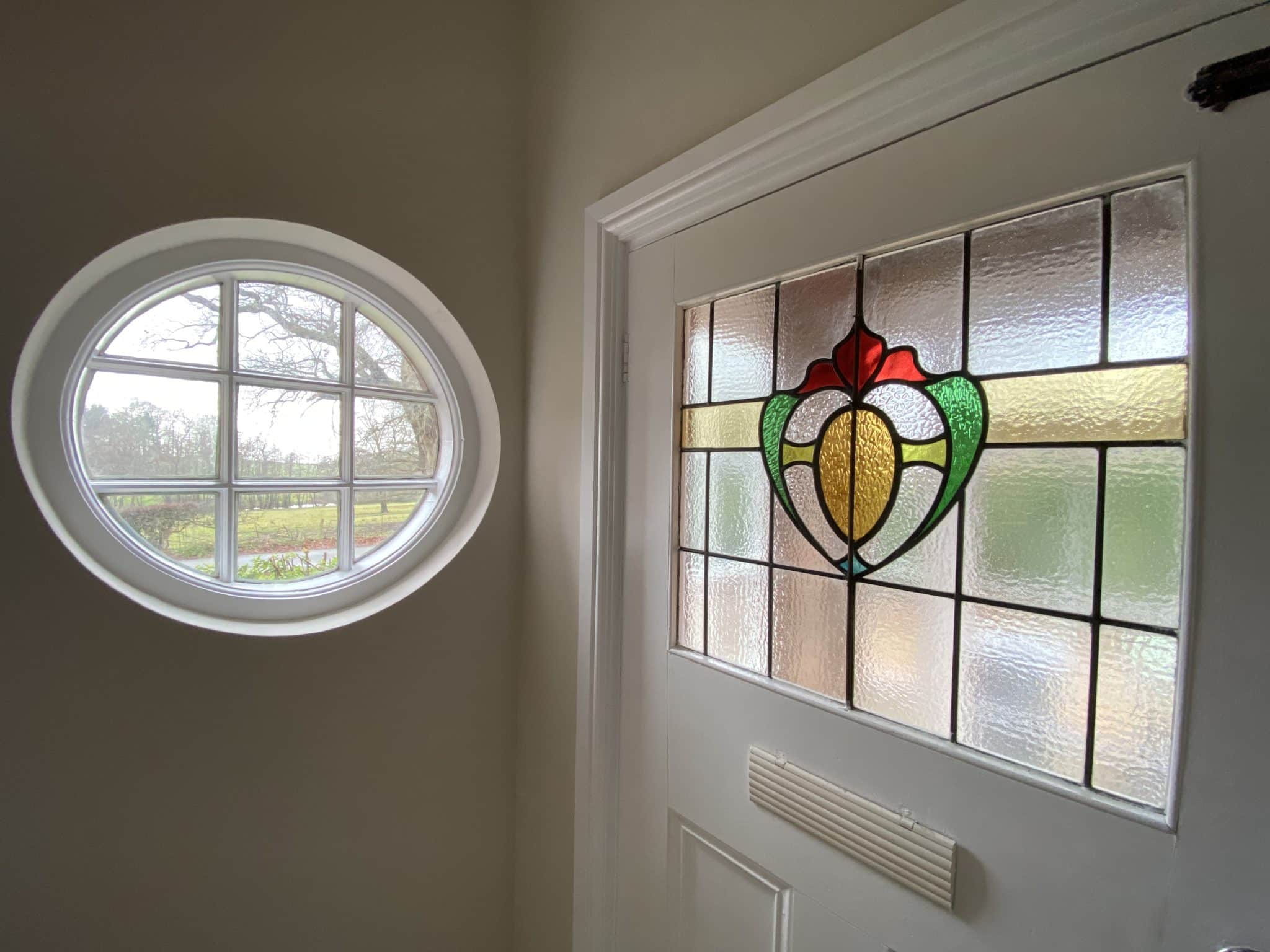 Main Entrance door, newly laid matting, an ideal area for coats and boots, exposed brick wall, door through to entrance hall with beautiful ornate stain glass window.