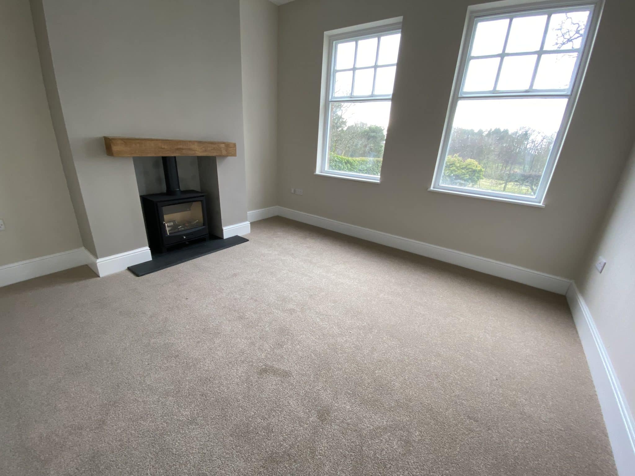 Two large windows to front enjoying views beyond the front garden and land across open countryside, newly installed feature cast iron wood burning stove with oak mantel and stone hearth.