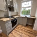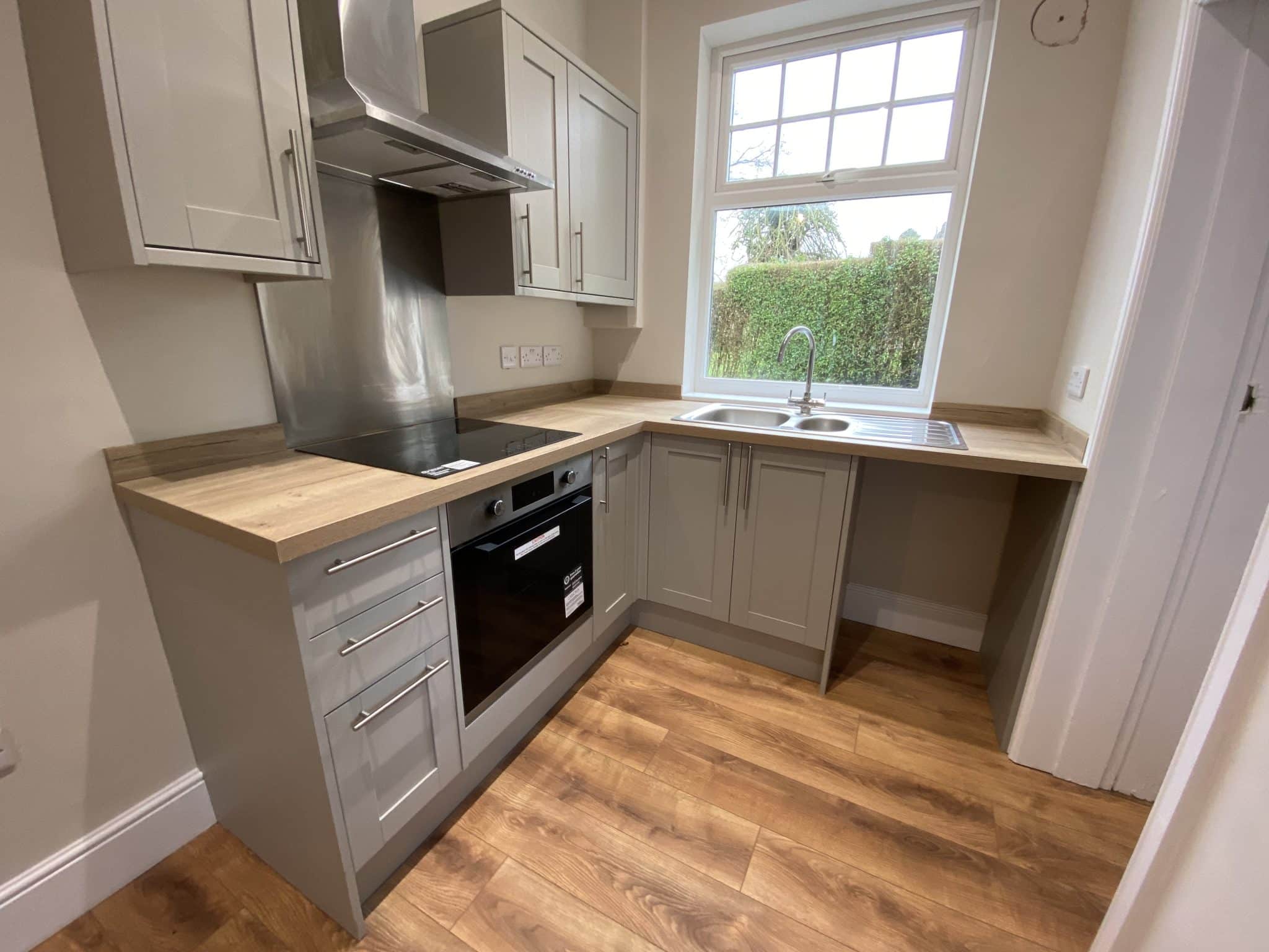 Newly fitted wall and base units with rolled edge laminated work top over, integrated electric hob and oven under, canopy hood over, fridge freezer standing space, slim line dishwasher space, external access door to rear.