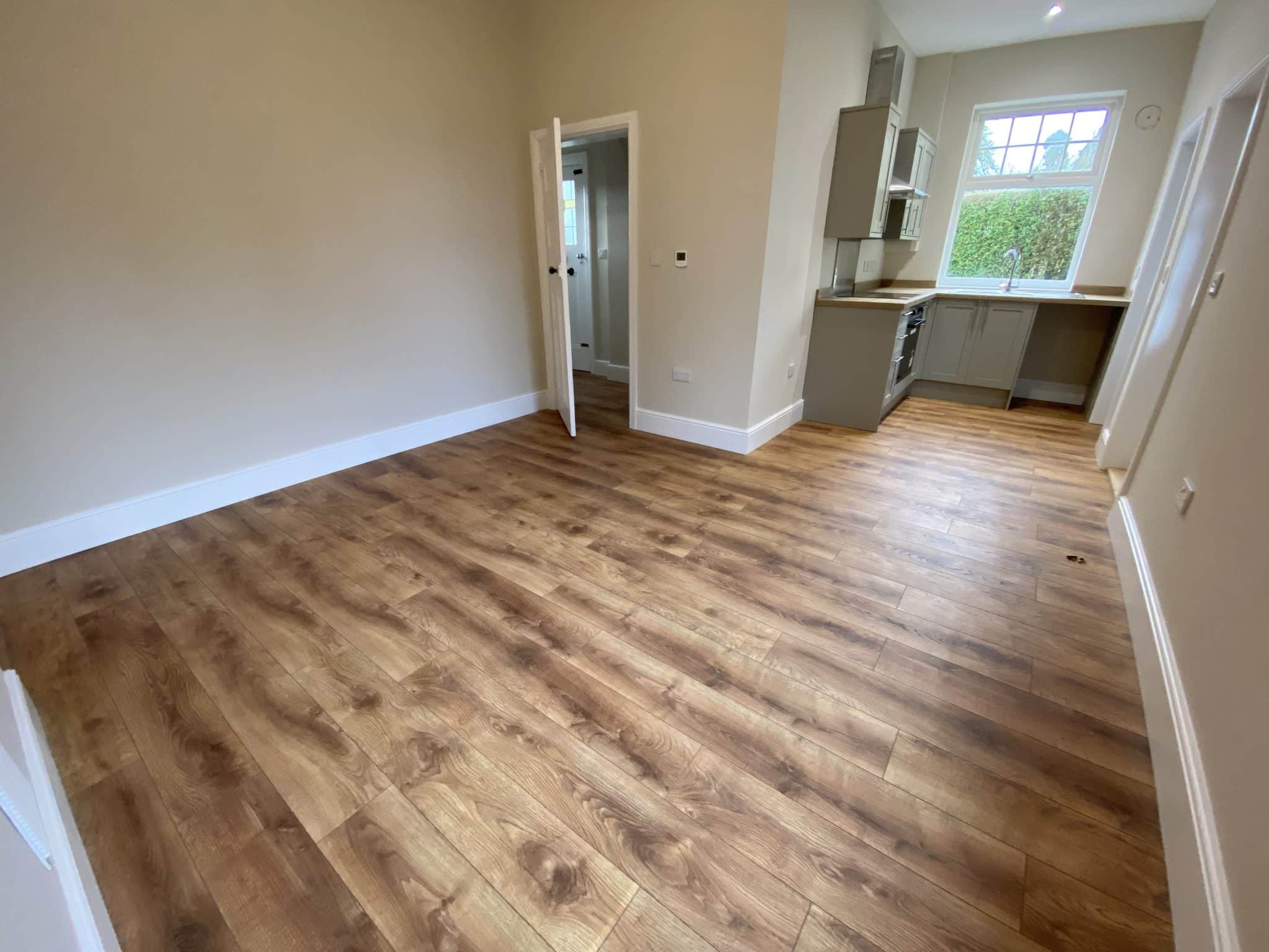 The Dining Area is situated to the rear of the house and is open plan to the Kitchen area, having full height built-in store cupboard with shelving adjacent to the chimney breast., windows to rear with views up the garden, laminate oak effect flooring.