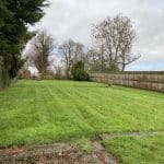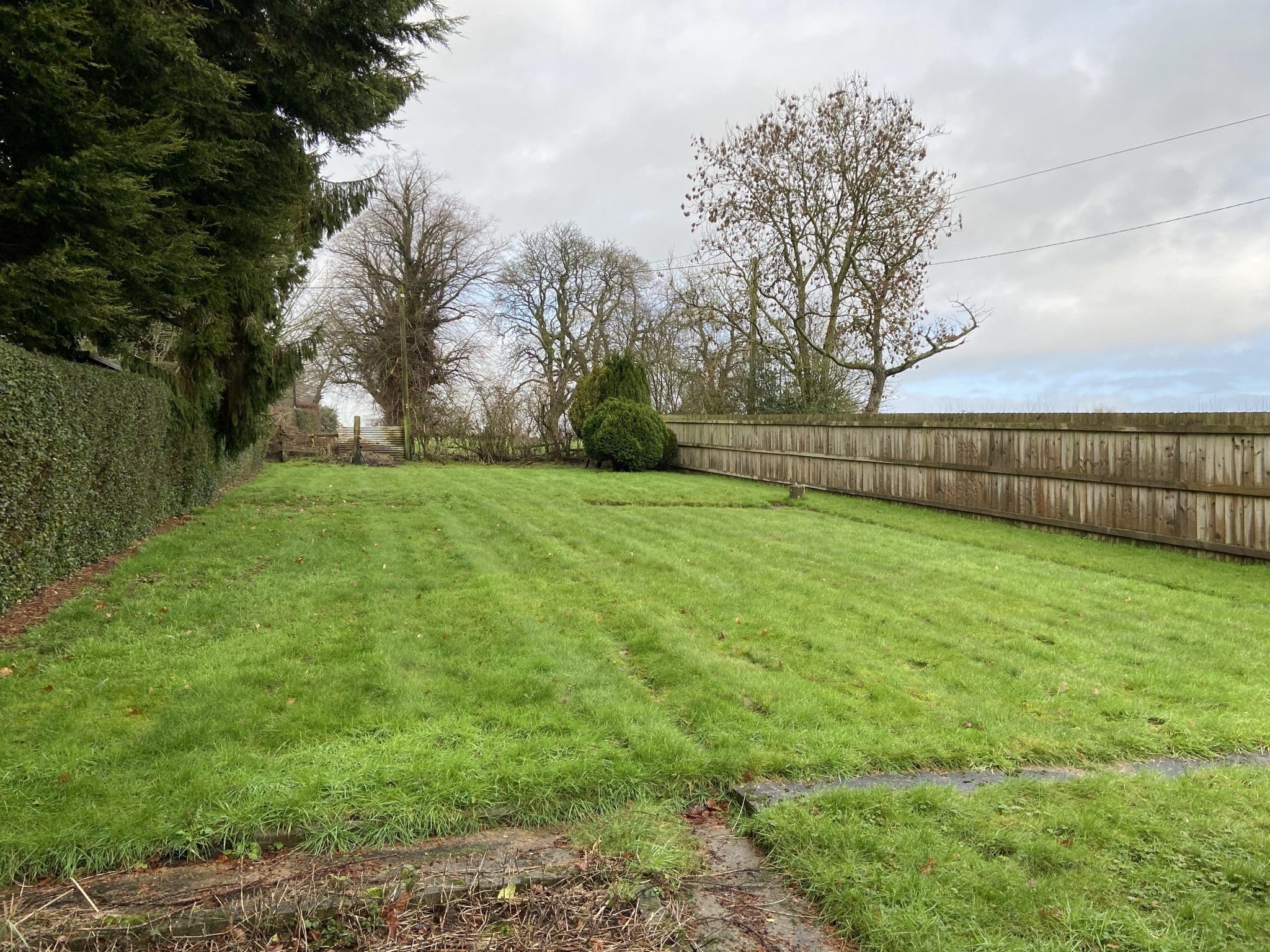 There is a paved path which leads to the door of the Entrance Porch, with the path continuing around to the rear of the property where there is a newly laid patio area to the immediate rear, outside WC with high flush WC and plant room with the hot water tank and air source heating system. The air source heating boiler is set to the side of the plant room. There are steps up from the patio to the large lawned garden which is enclosed by hedging and fencing and has a garden path. There is a first garden area to the side of the property containing flower and shrub beds.