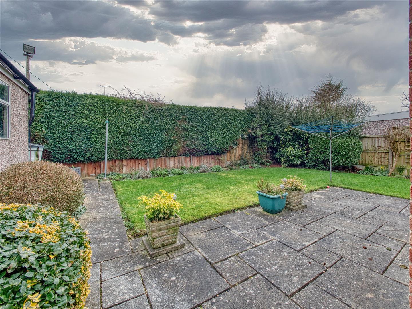 The rear garden is enclosed by fence and hedging, having patio seating area and predominantly lawned garden with a greenhouse set behind the garage.