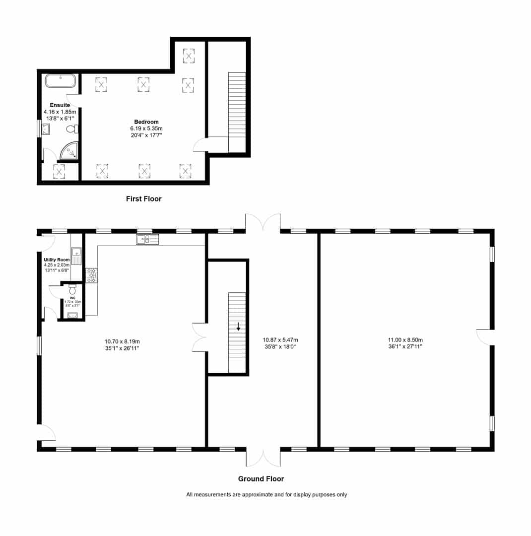 It includes a Kitchen/Dining Room, WC and Utility room. Stairs lead up to a large spacious bedroom with an ensuite bathroom on the first floor.