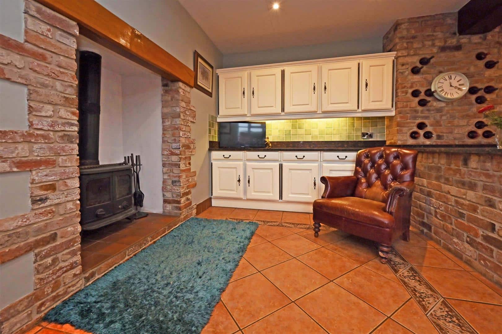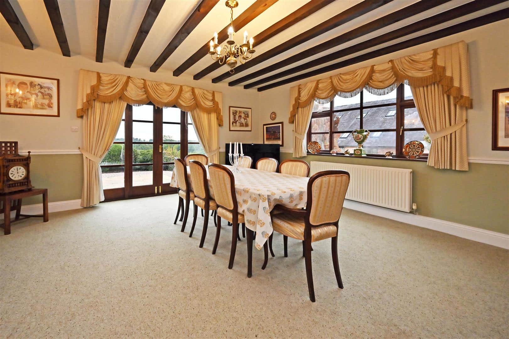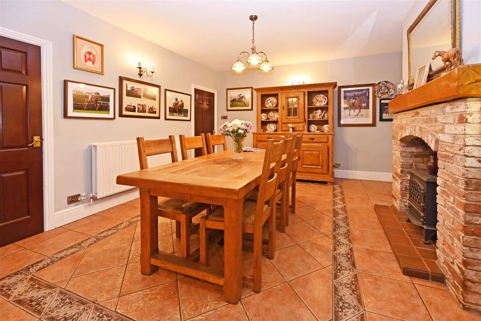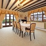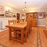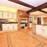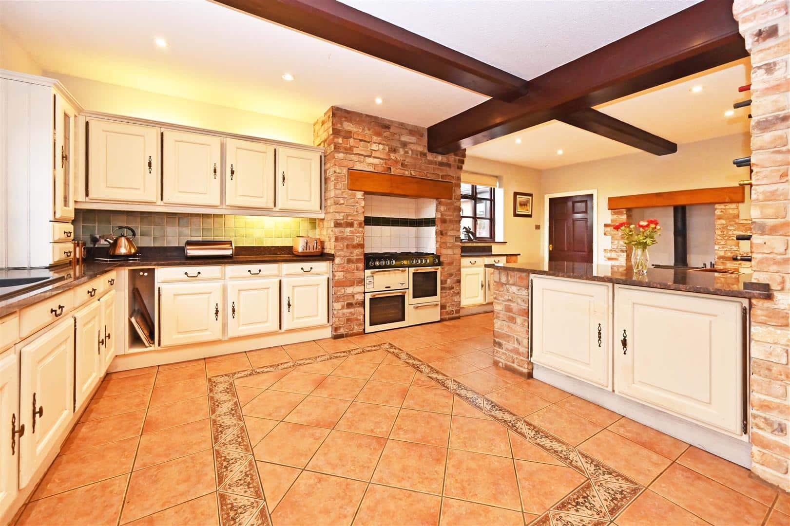 From the Hall there is a door to a formal Dining Room, again with doors to the terrace and views over the garden. From the Hall a further door leads to the Breakfast Room which in turn leads either to the Garden Room or into the Kitchen which is fitted with good quality cabinets with granite worktops, appliances and a “Cook Master” range cooker.