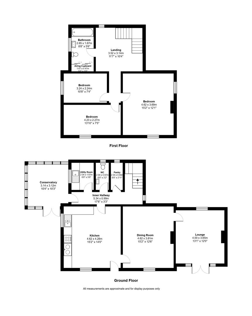 The ground floor offers entrance into a generously-sized dining kitchen, through to a dining room, with further access into a lounge with external patio doors. An inner hallway presents access to a useful utility room, a pantry offering storage, a cloakroom with w.c, and a pleasant conservatory. Climbing to the first floor, the dwelling presents three good-sized double bedrooms, a wide landing lending itself to a study or reading area, and a family bathroom hosting a bath, basin, w.c, and an airing cupboard.
